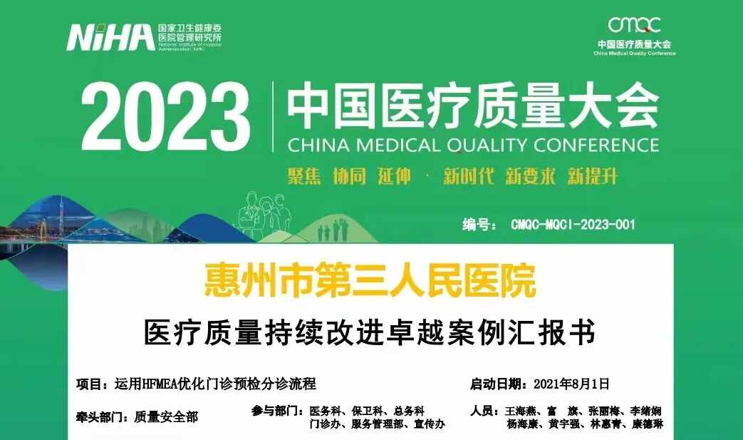2023年9月8日至9月10日,由國(guó)家衛(wèi)生健康委醫(yī)院管理研究所主辦的第二屆中國(guó)醫(yī)療質(zhì)量大會(huì)在廣州召開(kāi)?;葜菔械谌嗣襻t(yī)院項(xiàng)目《運(yùn)用HFMEA優(yōu)化門(mén)診預(yù)檢分診流程》被評(píng)為2023年醫(yī)療質(zhì)量安全持續(xù)改進(jìn)案例評(píng)選活動(dòng)“卓越案例”,并在第二屆中國(guó)醫(yī)療質(zhì)量大會(huì)上進(jìn)行展示和分享交流。