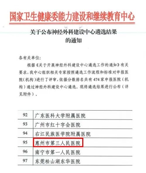 2023年1月,惠州市第三人民醫(yī)院神經(jīng)外科專(zhuān)科建設(shè)再獲佳績(jī),成功入選國(guó)家衛(wèi)健委首批“神經(jīng)外科建設(shè)中心”單位,標(biāo)志著惠州三院神經(jīng)外科診治條件與能力建設(shè)得到國(guó)家權(quán)威機(jī)構(gòu)和專(zhuān)家的認(rèn)可并邁入發(fā)展的快車(chē)道!