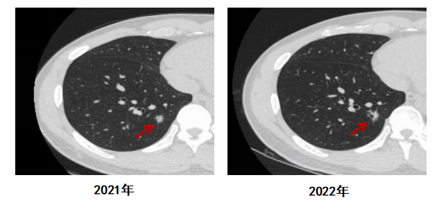 Z先生,28歲,不吸煙,無(wú)家族史、無(wú)高危環(huán)境及職業(yè)接觸史及慢性肺部疾病史,2022年體檢發(fā)現(xiàn)左肺小結(jié)節(jié),邊緣規(guī)則,大小約5mm, 醫(yī)生建議他做年度CT檢查。2023年體檢發(fā)現(xiàn)左肺結(jié)節(jié)部分吸收,大小為3mm。