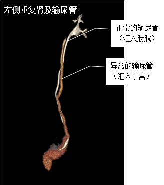 在楊主任的建議下,小薇完善了泌尿系造影檢查(CTU),CT造影重建發(fā)現(xiàn)小薇的左側(cè)腎臟為重復(fù)腎,有兩套集合系統(tǒng)和輸尿管,兩條輸尿管伴行向下,其中一條正常匯入膀胱,另一條則顯影較慢,看不清開(kāi)口到何處!