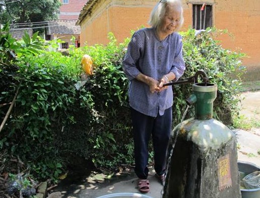 老婆婆平常一個(gè)人在這里打水回屋里做飯。她的視力恢復(fù)得非常好,已經(jīng)能夠做這些事情!但是阿婆她女兒嫁出去后,現(xiàn)在自己一個(gè)人生活,真的是非常不容易!看到阿婆的家里家外和她飯桌上吃的東西,讓我們也感到非常心酸!