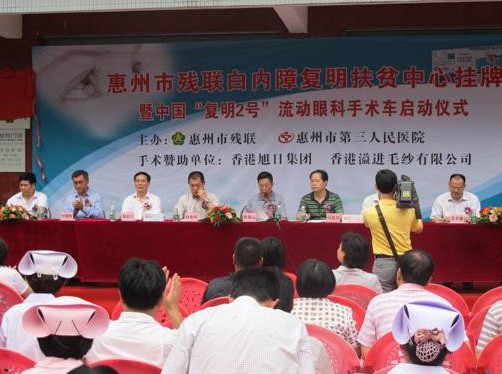 2011年5月12日,惠州市殘聯(lián)與惠州市第三人民醫(yī)院舉行了惠州市殘聯(lián)白內(nèi)障復(fù)明扶貧中心暨中國(guó)“復(fù)明2號(hào)”流動(dòng)眼科手術(shù)車啟動(dòng)儀式!從此手術(shù)車得以下鄉(xiāng)到惠州各村鎮(zhèn)去為老人們免費(fèi)篩查白內(nèi)障和免費(fèi)做手術(shù),目前為止已經(jīng)為近1000個(gè)老人做了手術(shù)。