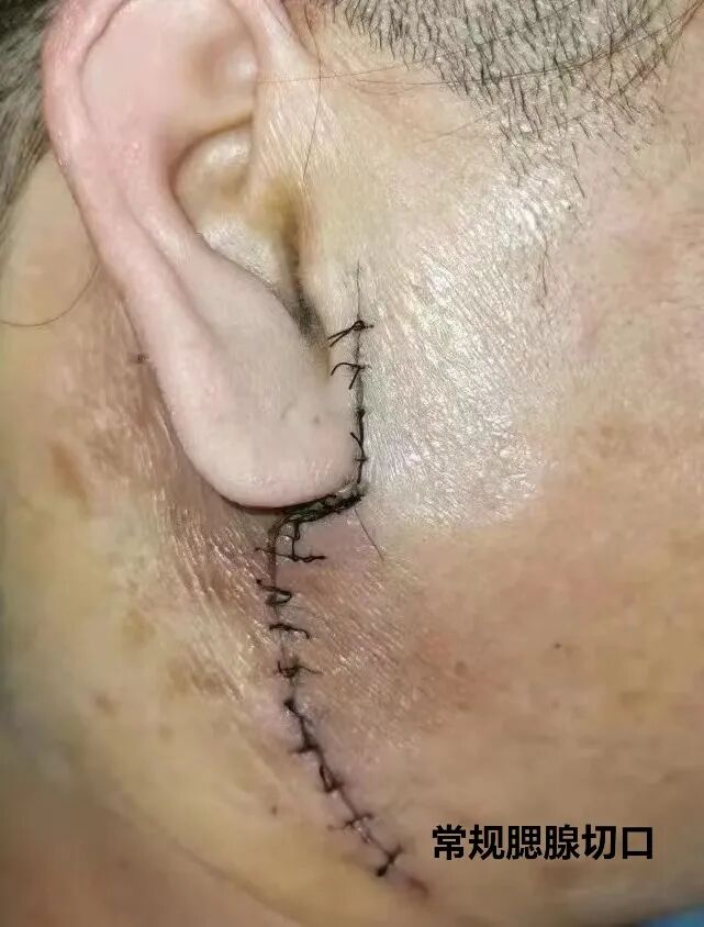 與傳統(tǒng)的腮腺手術(shù)相比,該手術(shù)的術(shù)后創(chuàng)傷小、并發(fā)癥少、安全、康復(fù)快,而且避免了常規(guī)的“S”形面部切口和疤痕,切口隱蔽,頭發(fā)可遮蔽耳后疤痕,面部美觀無疤痕,尤其適合女性患者。