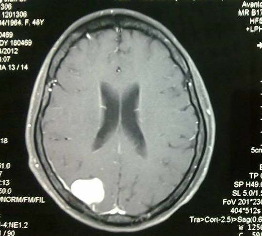 術(shù)前MRI增強(qiáng)成像,腫瘤位于右頂葉,與矢狀竇較為接近,而術(shù)中實際情況是有一部分腫瘤組織直接貼在矢狀竇壁上,手術(shù)難度比術(shù)前預(yù)計的更大。
