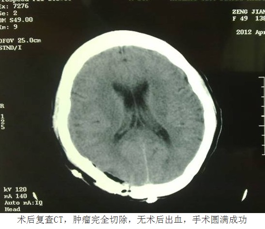 憑借先進(jìn)的技術(shù)與豐富的經(jīng)驗,換來的是患者快速的康復(fù)。由于手術(shù)核心部分均是在顯微鏡下操作,在完整切除腫瘤的同時,最大限度減少了對周圍正常腦組織的損傷,術(shù)中出血很少,因此術(shù)后患者沒有出現(xiàn)任何中樞感染、神經(jīng)功能障礙等異常情況,復(fù)查頭顱CT顯示腫瘤完整切除,無術(shù)后出血。術(shù)后第十天,患者即痊愈出院。