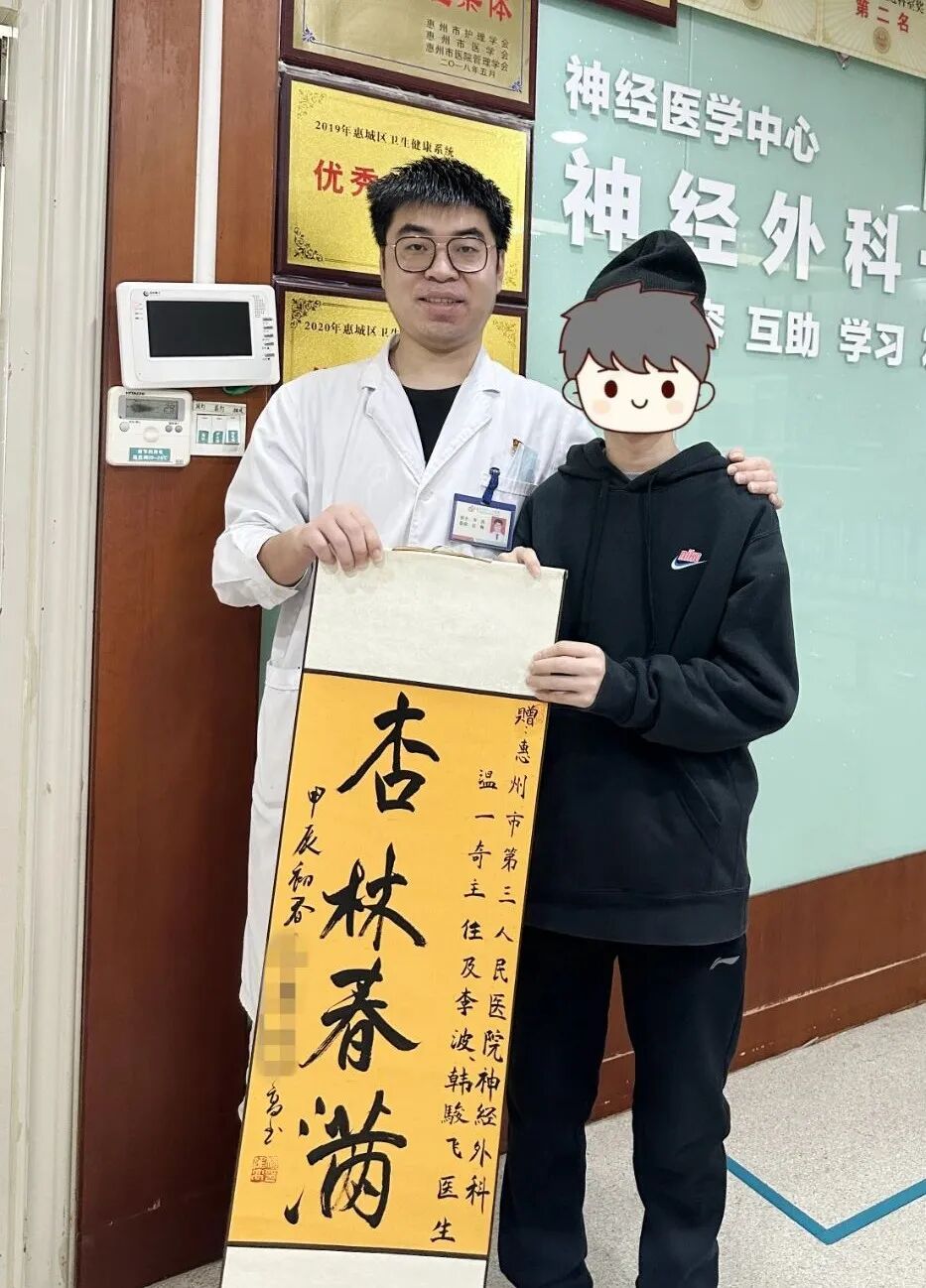 近日,15歲少年小齊(化名)再次來到惠州市第三人民醫(yī)院,將親筆書法作品交到神經(jīng)外科溫一奇和韓駿飛兩位醫(yī)生手中。