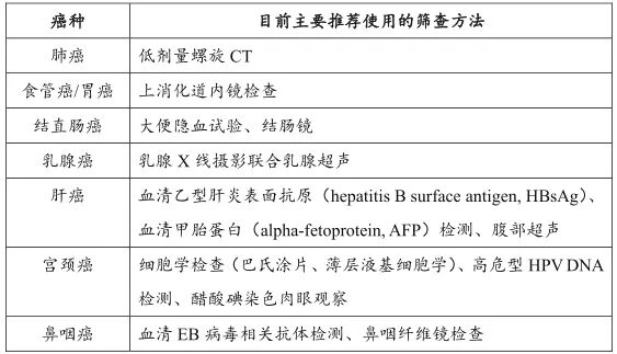 但是,并非人人都適合癌癥篩查。為避免過度診斷和過度治療,癌癥篩查應在高危人群中開展。國際公認適宜篩查的癌種包括肺癌、結直腸癌、乳腺癌、宮頸癌。我國高發(fā)的食管癌、胃癌、肝癌,以及廣東、廣西地區(qū)高發(fā)的鼻咽癌,也已列入我國正在開展的人群癌癥早診早治項目中。針對上述癌癥高危人群,推薦使用的篩查方法如下: