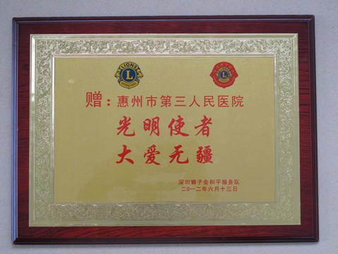 2012年7月18日,我院收到來(lái)自深圳市獅子會(huì)和平服務(wù)隊(duì)寄來(lái)的牌匾——“光明使者,大愛(ài)無(wú)疆”。