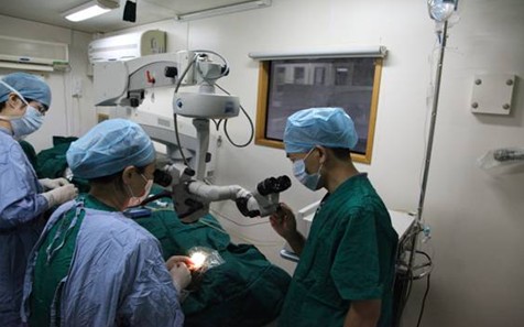 “復(fù)明2號(hào)”狹小的手術(shù)間,周靈主任正在為一名白內(nèi)障村民做手術(shù)