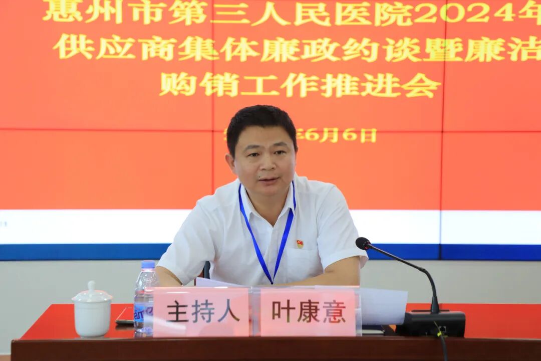 2024年6月6日下午,惠州市第三人民醫(yī)院召開(kāi)2024年供應(yīng)商集體廉政約談暨廉潔購(gòu)銷(xiāo)工作推進(jìn)會(huì)。會(huì)議由醫(yī)院紀(jì)委書(shū)記葉康意同志主持。