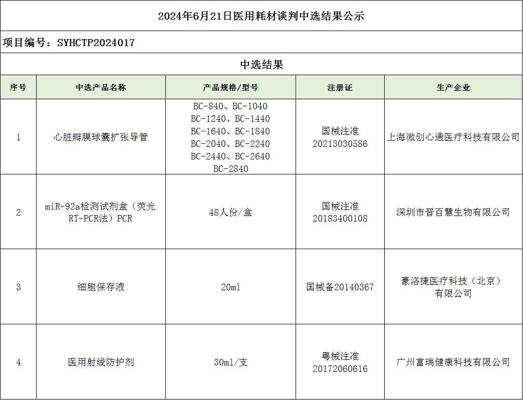 2024年6月21日醫(yī)用耗材談判中選結(jié)果公示