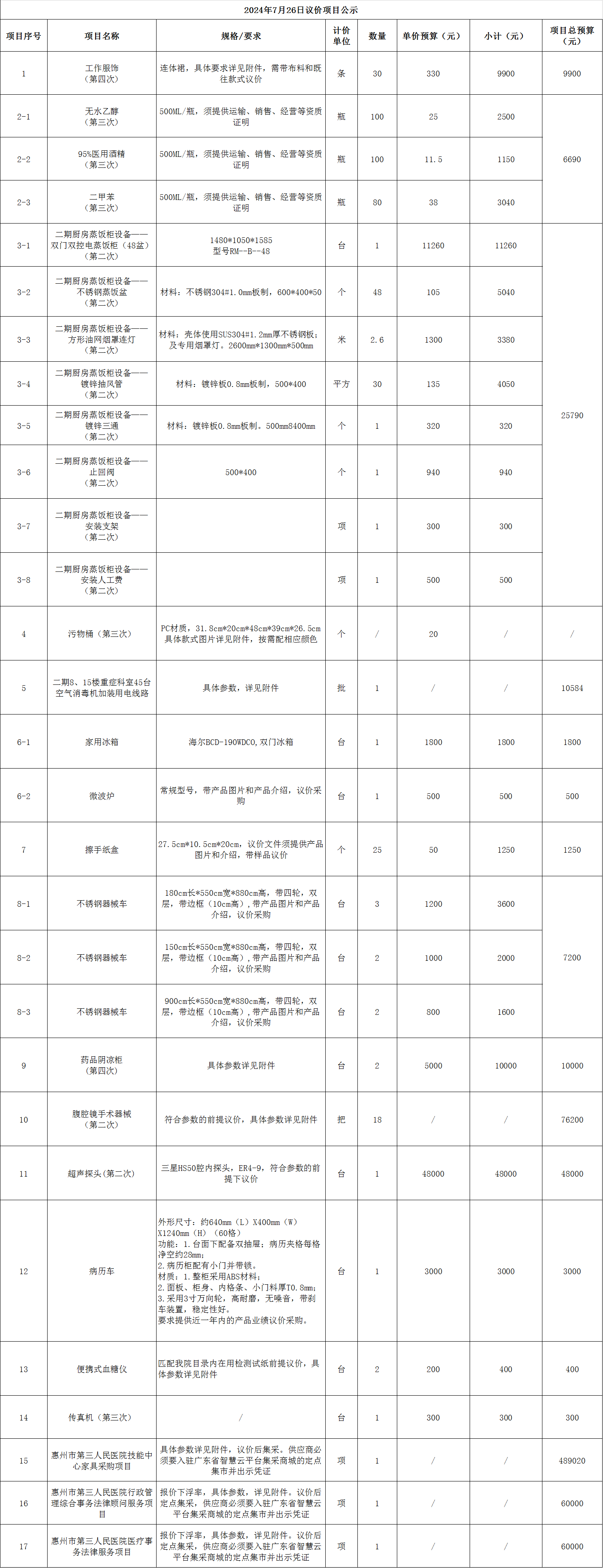 惠州市第三人民醫(yī)院擬定一批采購項(xiàng)目進(jìn)行議價(jià)采購,歡迎符合資格條件的投標(biāo)人投標(biāo)。