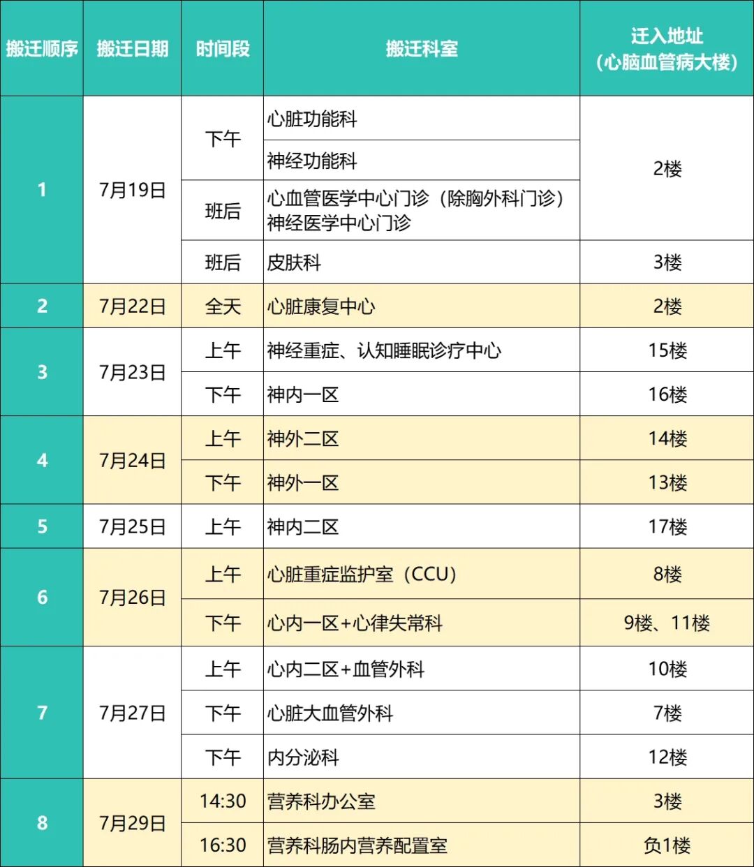 為了更好地滿足廣大心腦血管病患者的醫(yī)療需求,提供更為專業(yè)、高效的診療服務(wù),我院精心打造了全新的心腦血管病大樓(⑦號樓)。7月13日,乳腺外科、乳腺影像科和甲狀腺外科遷入后,整體運(yùn)行良好。經(jīng)過精心籌備,醫(yī)院決定從7月19日起,陸續(xù)將心血管醫(yī)學(xué)中心和神經(jīng)醫(yī)學(xué)中心學(xué)科群,以及其他部分專科和門診搬遷至該樓。具體安排如下圖: