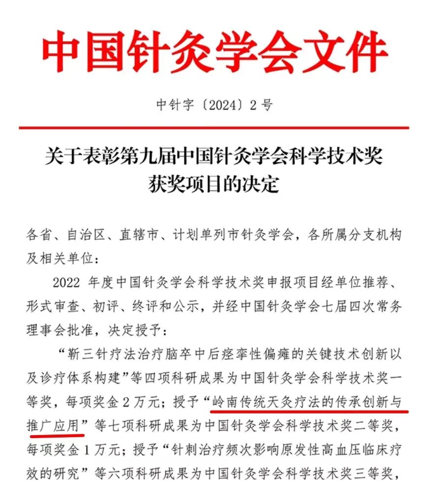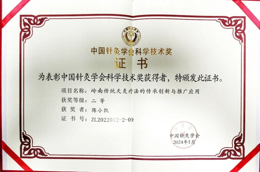 近日,第九屆中國針灸學(xué)會科學(xué)技術(shù)獎獲獎項(xiàng)目表彰決定公布,廣東省名中醫(yī)、惠州市第三人民醫(yī)院康復(fù)醫(yī)學(xué)中心主任陳小凱與廣東省中醫(yī)院等醫(yī)療機(jī)構(gòu)專家聯(lián)合完成的項(xiàng)目“嶺南傳統(tǒng)天灸療法的傳承創(chuàng)新與推廣應(yīng)用”獲得臨床科學(xué)技術(shù)二等獎!
