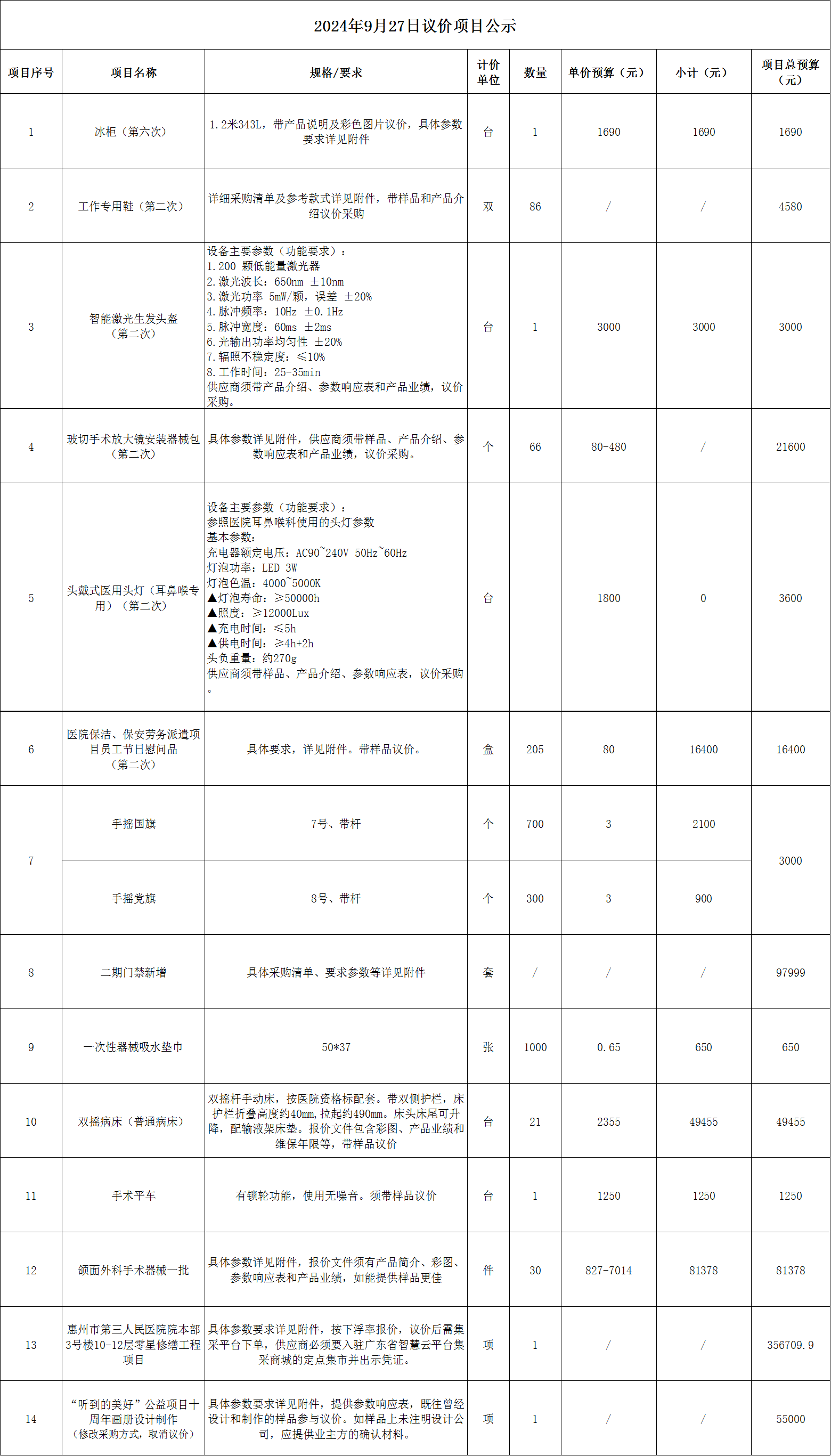 惠州市第三人民醫(yī)院擬定一批采購項(xiàng)目進(jìn)行議價(jià)采購,歡迎符合資格條件的投標(biāo)人投標(biāo)。