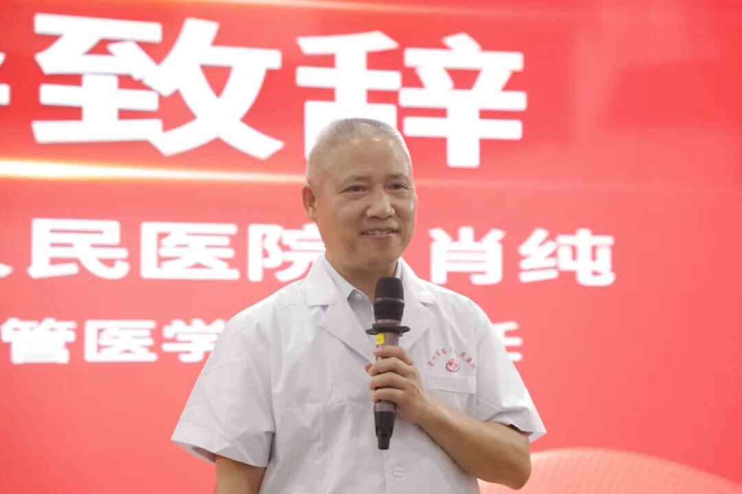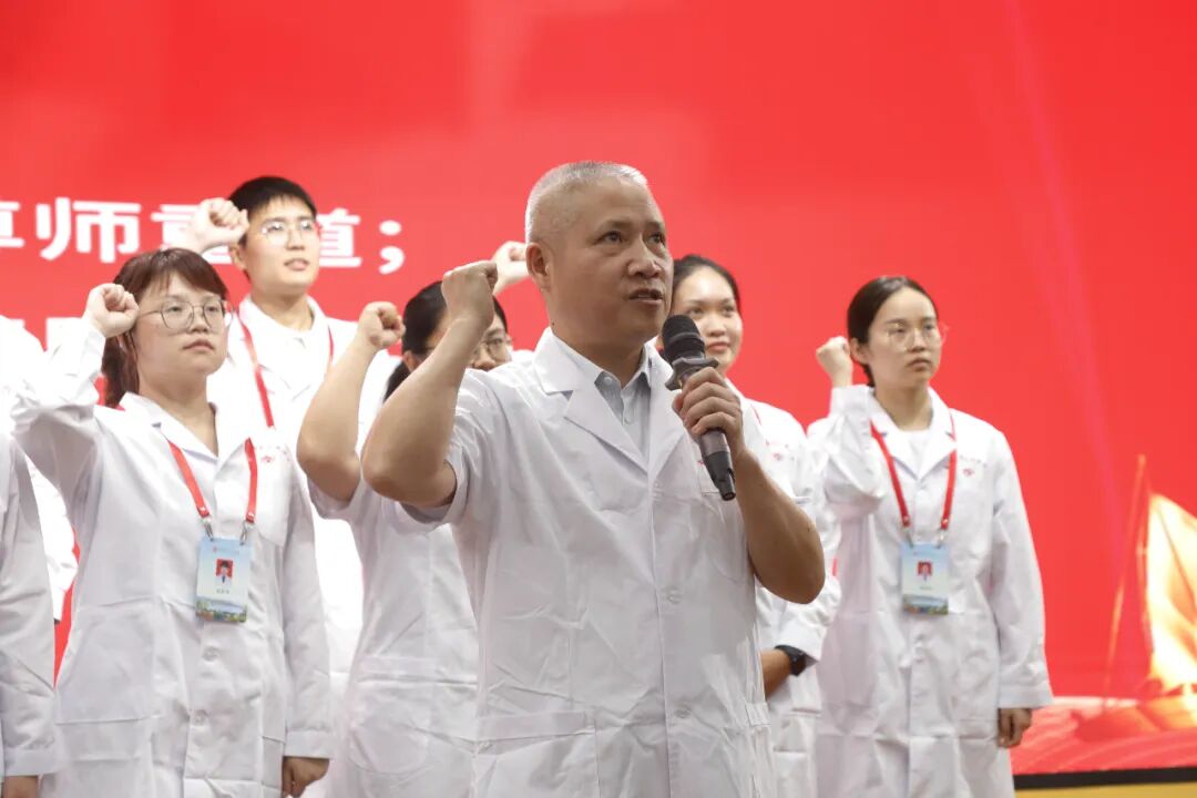 醫(yī)院黨委書記肖純帶領(lǐng)全場所有醫(yī)務(wù)人員進行宣誓。全體起立,緊握右拳,意志堅定,宣誓志愿獻身人類的健康事業(yè)與維護醫(yī)學的尊嚴和神圣。
