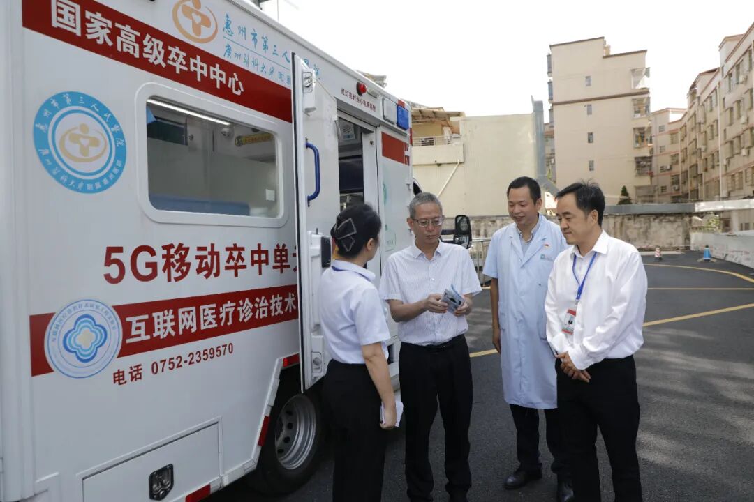 最后,調(diào)研組一行現(xiàn)場參觀了廣東省首臺、惠州唯一“5G移動卒中單元”救護車,詳細(xì)聽取并深入了解了5G移動卒中救護車的基本情況及救治模式。