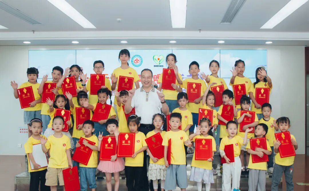 “妙音天使童聲合唱團(tuán)”的孩子們拿到團(tuán)員證后與“聽(tīng)到的美好”聽(tīng)障兒童及耳疾患者醫(yī)療救助公益項(xiàng)目發(fā)起人王豪開(kāi)心合影