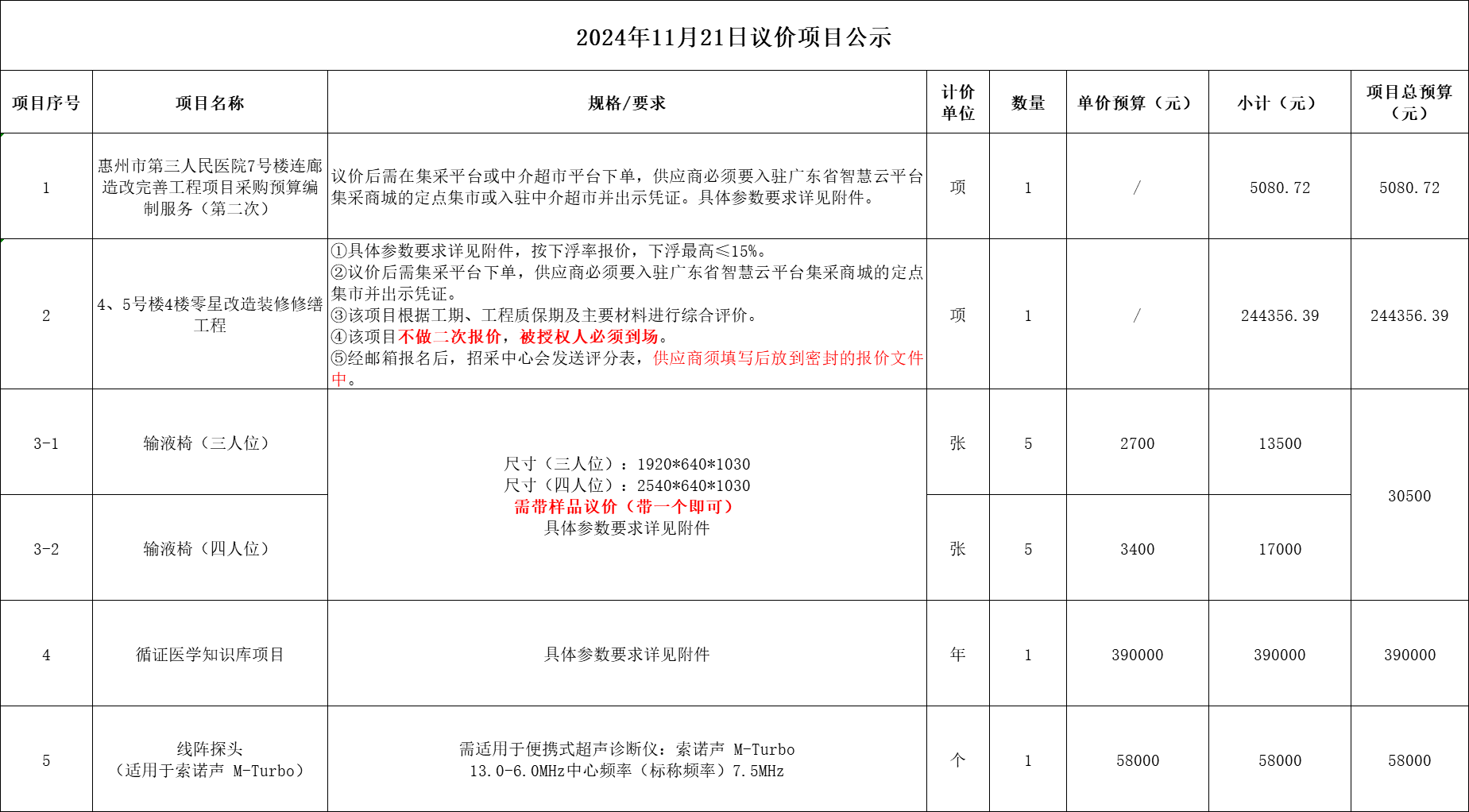 1.符合資格的供應(yīng)商應(yīng)當在公告發(fā)布之日起至2024年11月20日00:00前在公告文章末尾(入口:惠州市第三人民醫(yī)院官網(wǎng)→采購公告→20241121議價項目公示頁面)下載附件獲取議價文件(含報名、報價文件模板及議價項目相關(guān)附件等)。