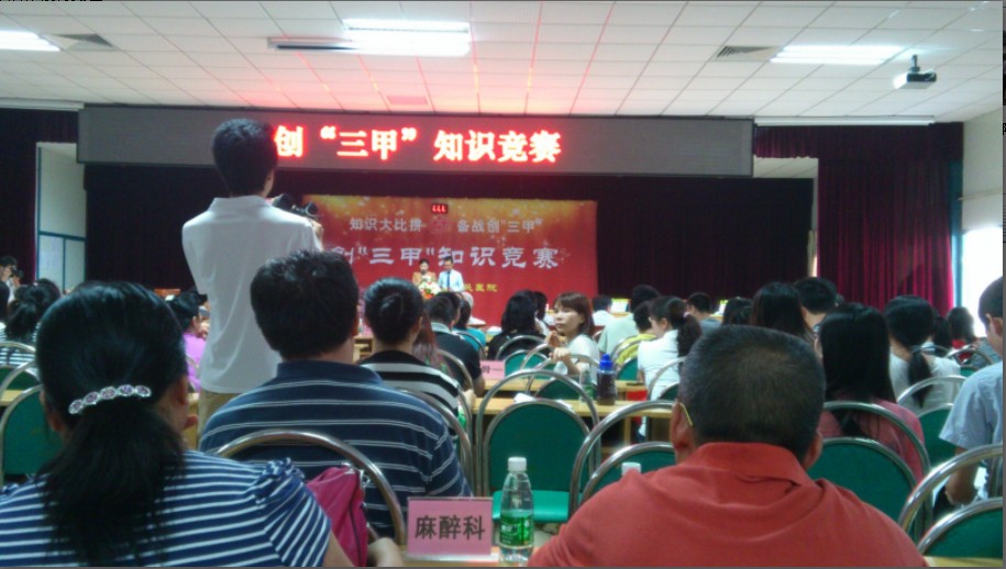 2012年10月14日上午,在三院會議室進(jìn)行了以創(chuàng)“三甲”為主題的知識競賽,競賽內(nèi)容有三基知識、核心制度、法律法規(guī)、醫(yī)院等級評審標(biāo)準(zhǔn)及內(nèi)容。全院有35隊105人參賽,其中臨床醫(yī)技科室30隊90人,行政職能科室5隊15人。