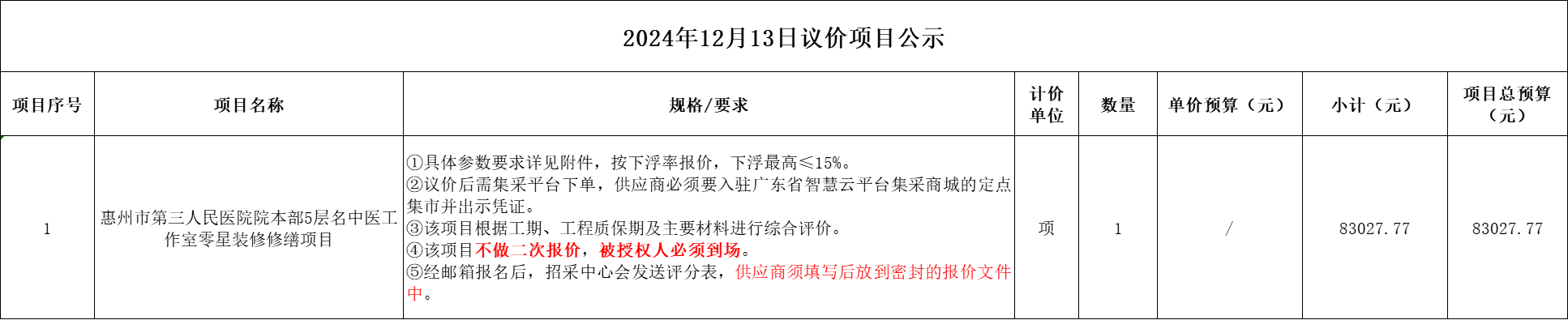 1.符合資格的供應(yīng)商應(yīng)當(dāng)在公告發(fā)布之日起至2024年12月12日00:00前在公告文章末尾(入口:惠州市第三人民醫(yī)院官網(wǎng)→采購公告→20241213議價(jià)項(xiàng)目公示頁面)下載附件獲取議價(jià)文件(含報(bào)名、報(bào)價(jià)文件模板及議價(jià)項(xiàng)目相關(guān)附件等)。