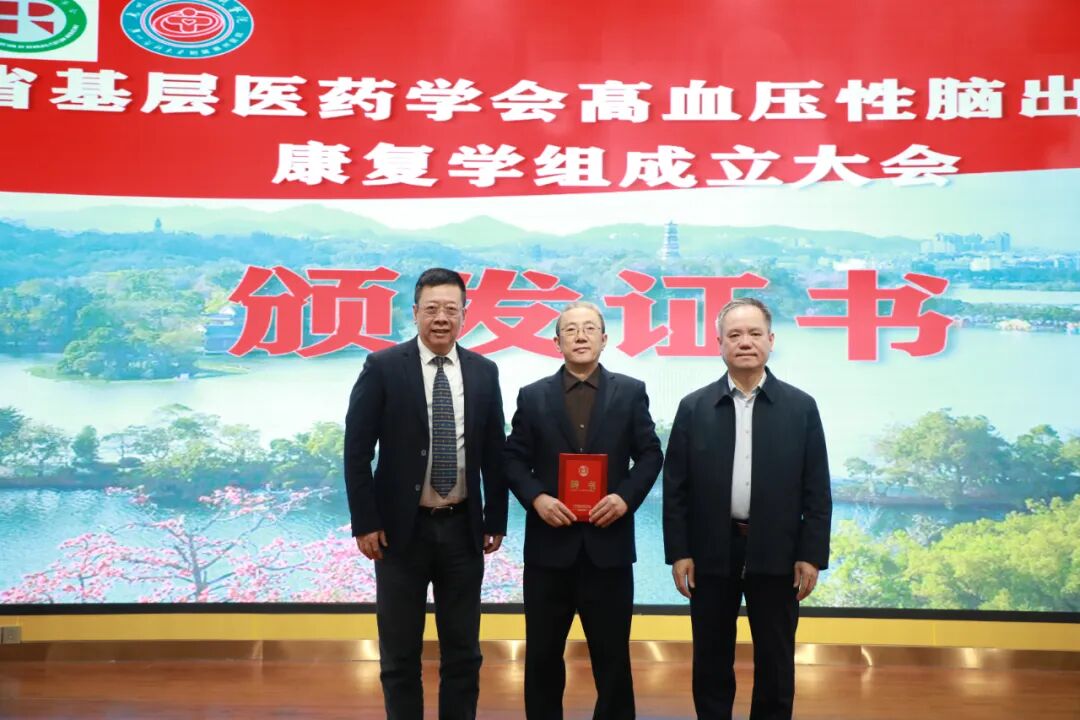 在熱烈的掌聲中,駱錦標(biāo)主任委員宣布廣東省基層醫(yī)藥學(xué)會(huì)高血壓性腦出血專委會(huì)康復(fù)學(xué)組正式成立。隨后,黎友隆副秘書長、駱錦標(biāo)主委為專委會(huì)康復(fù)學(xué)組組長陳小凱(惠州市第三人民醫(yī)院)及五位副組長蘭月(廣州市第一人民醫(yī)院)、陳尚杰(深圳市寶安區(qū)人民醫(yī)院)、孟兵(東莞市石排醫(yī)院)、鮑曉(粵北人民醫(yī)院)、顏洪亮(梅州市平遠(yuǎn)縣中醫(yī)院)頒發(fā)證書。