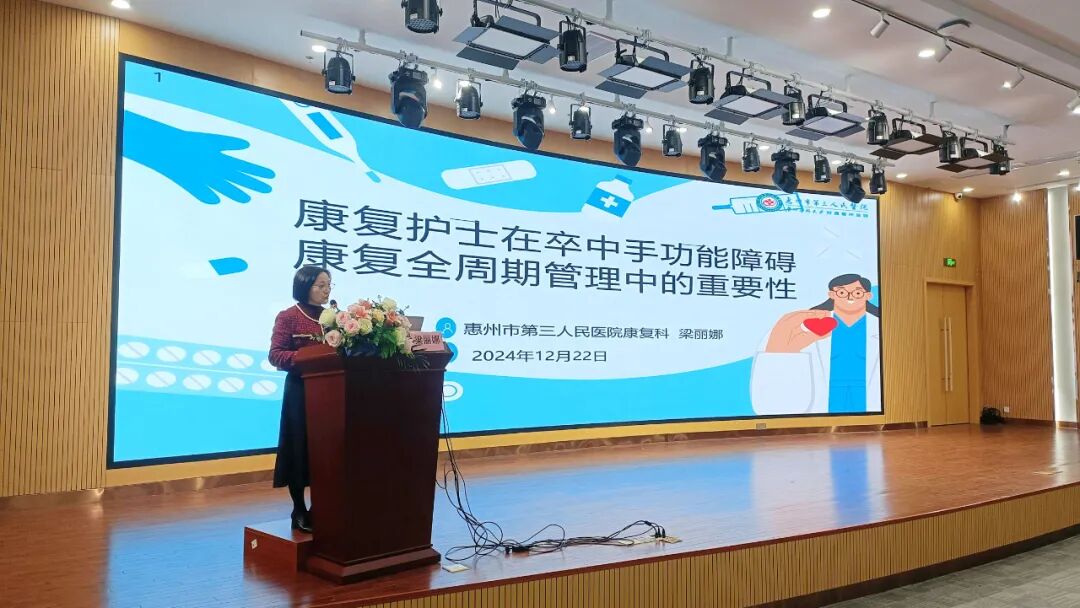 惠州市第三人民醫(yī)院副主任護(hù)師梁麗娜分享了“康復(fù)護(hù)士在卒中后手功能障礙康復(fù)全周期管理中的重要性”專題,從護(hù)理意義、技術(shù)、注意事項(xiàng)方面闡述了全周期手功能康復(fù)護(hù)理。