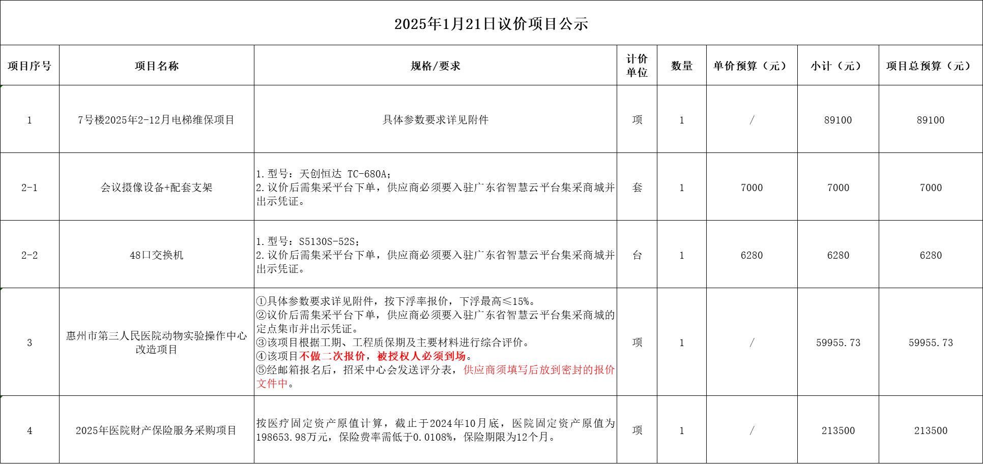 1.符合資格的供應商應當在公告發(fā)布之日起至2025年1月20日00:00前在公告文章末尾(入口:惠州市第三人民醫(yī)院官網(wǎng)→采購公告→20250121議價項目公示頁面)下載附件獲取議價文件(含報名、報價文件模板及議價項目相關附件等)。