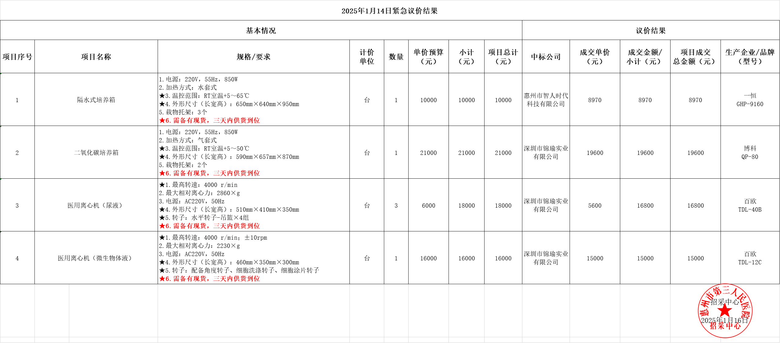 惠州市第三人民醫(yī)院20250114緊急議價(jià)結(jié)果公示