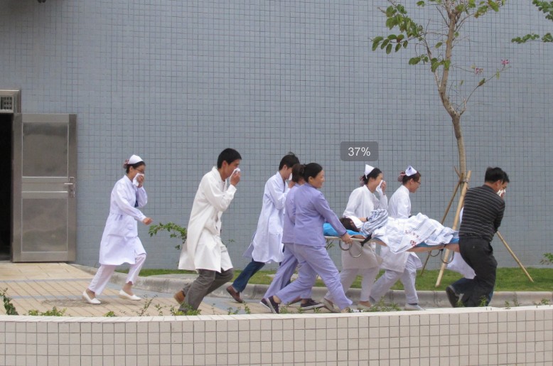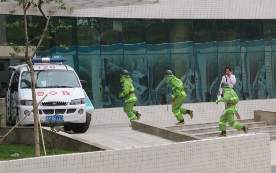 隨著綜合大樓17樓窗口飄出的煙霧彈,保安人員及時通知院領(lǐng)導到指揮中心進行現(xiàn)場指揮,向全院發(fā)布了火警,愛瑪客保安部消防應急分隊2分鐘內(nèi)趕到了滅火場地,同時通知了電工關(guān)閉相關(guān)電源、電梯工解救被困人員,相關(guān)科室聽從指揮迅速分批疏散,整個演練井然有序、工作人員、病人及資料檔案安全到達。