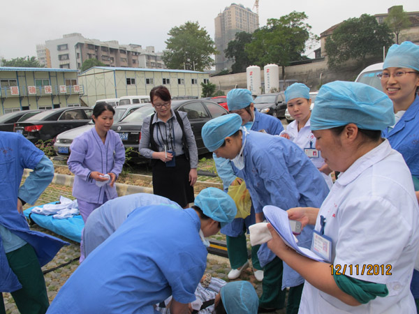 隨著外科綜合大樓飄出的煙霧,參與演練的保安人員迅速在各個消防通道通過手勢和指令引導(dǎo)大家撤退到安全區(qū)域,院領(lǐng)導(dǎo)到現(xiàn)場指揮,手術(shù)室在主任和護士長的指揮下,迅速組織麻醉醫(yī)生,護士及運送部人員搬運手術(shù)病人逃生,手術(shù)室與其他科室不同,病人生命支持情況復(fù)雜,環(huán)境密閉。如果剛好在手術(shù)過程右大出血的病人,我們應(yīng)該立即用止血鉗夾閉出血點,給與紗快填充止血,用無菌敷料先包裹關(guān)閉體腔迅速轉(zhuǎn)運。全麻病人要與麻醉師一起用簡易呼吸器和藥品保證患者生命體征維持,與手術(shù)醫(yī)生,麻醉師,護士一起將病人撤離手術(shù)間到安全地方。