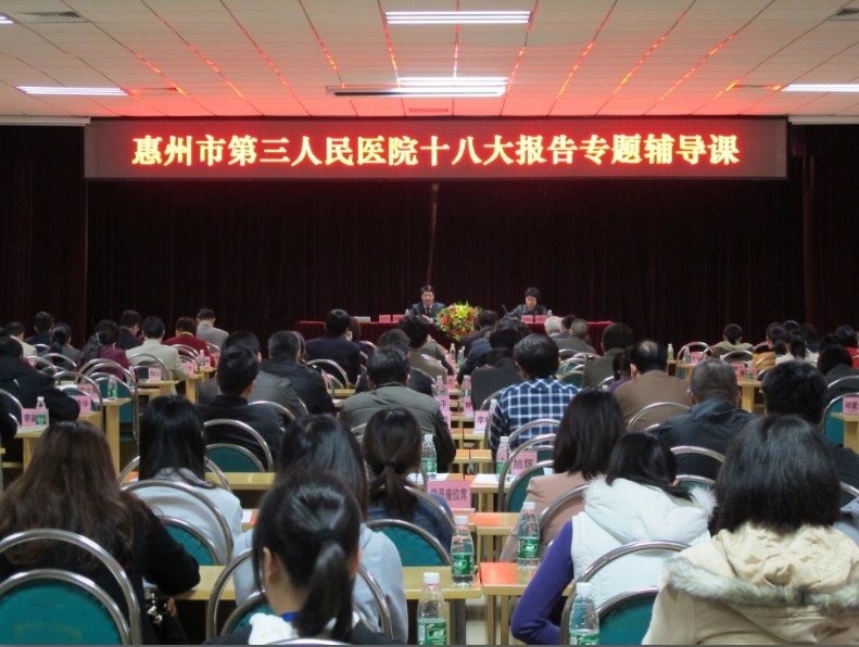 2012126下午,惠州市第三人民醫(yī)院在工地會議室舉辦以“堅定不移沿著中國特色社會主義道路前進為全面建成小康社會而奮斗”為主題的十八大報告專題輔導課,中層干部和黨員約250人參加了這次輔導課。區(qū)委黨校陳春梧副校長精彩的講課迎來全場陣陣熱烈的掌聲。