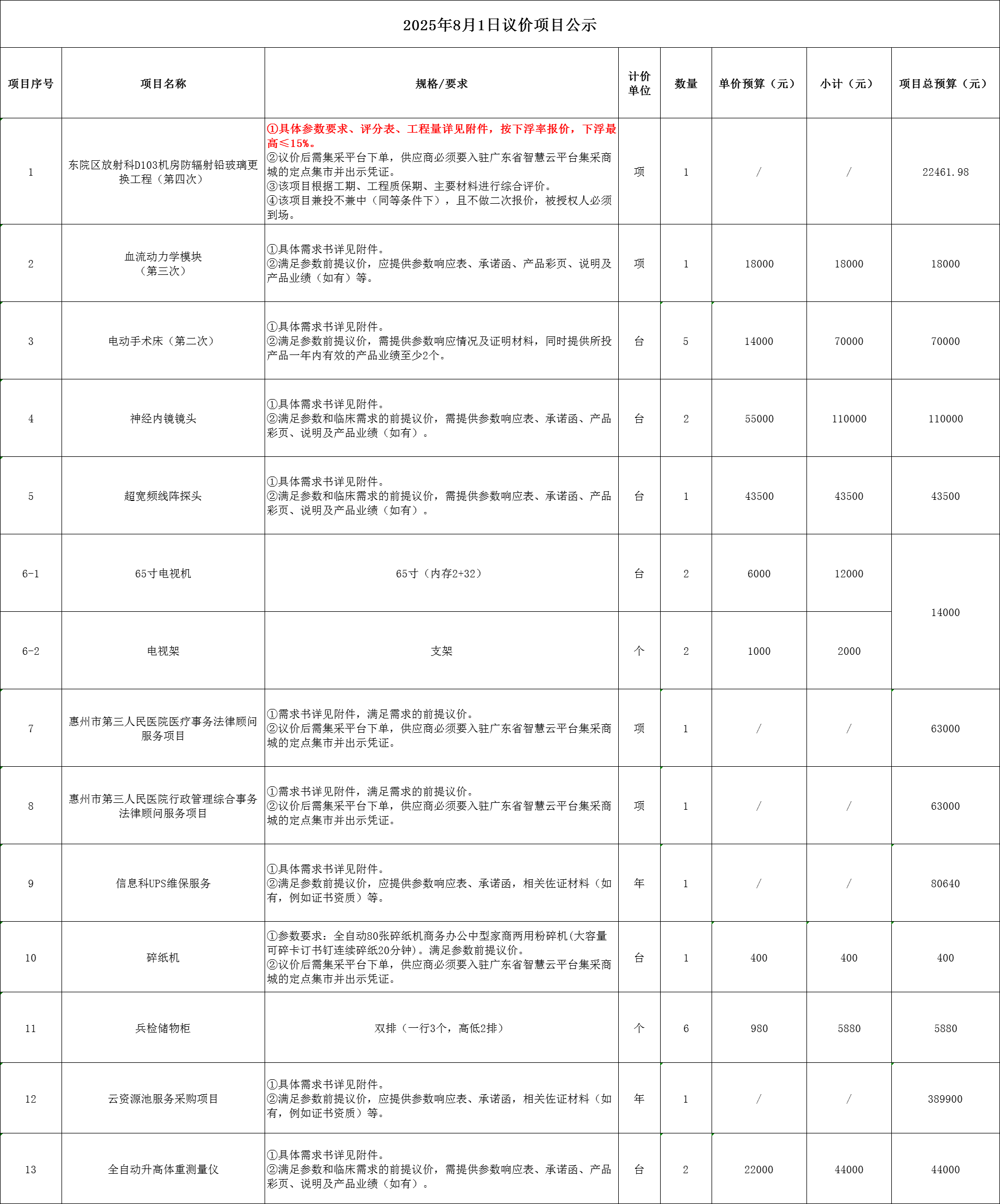惠州市第三人民醫(yī)院擬定一批采購(gòu)項(xiàng)目進(jìn)行議價(jià)采購(gòu),歡迎符合資格條件的投標(biāo)人投標(biāo)。
