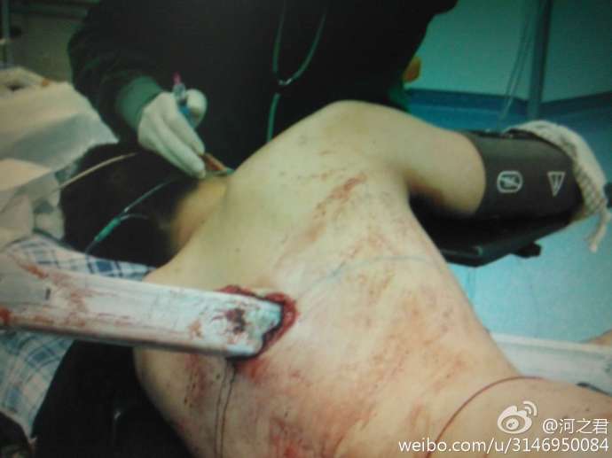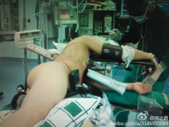 該患者為一年輕男性,一根巨大的金屬護(hù)欄從他的右側(cè)胸部穿透過,兩端露出的長度均有10余公分長,傷口處不斷流出大量的鮮血?;颊咭庾R淡漠,全身冰涼,血壓測不到,生命危在旦夕!患者此時意識已不清,未繳納住院費用,但為搶救患者生命,我院立即啟動綠色通道,完善術(shù)前準(zhǔn)備,急診送入手術(shù)室急診手術(shù)!