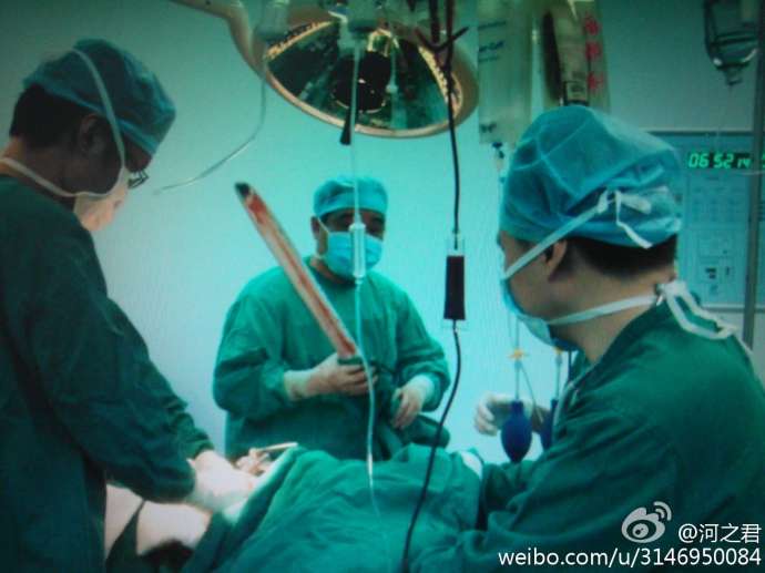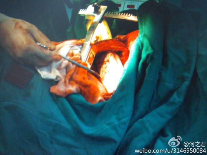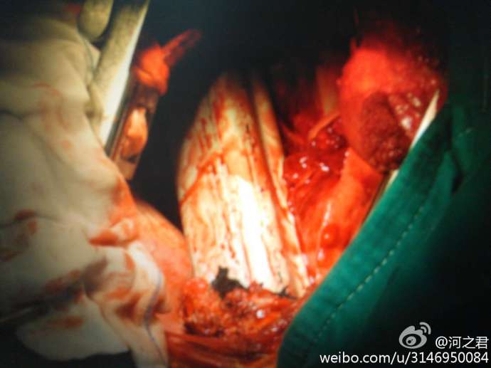 手術(shù)可真不簡單,為將其穿透胸腔的金屬護(hù)欄如何拿出來又不至加重患者損害,著實讓手術(shù)醫(yī)師頗費心機(jī)。金屬護(hù)欄穿透其右側(cè)胸部,傷口旁1-2cm,就是人的脊柱及心臟。稍有不慎即可損傷脊髓及心臟,導(dǎo)致患者癱瘓及死亡。心血管醫(yī)學(xué)中心心胸外科鐘衛(wèi)權(quán)主任和張陽春醫(yī)生,沉著、冷靜、小心翼翼地處理其傷口,分離肌肉,組織及異物、止血,輸液,輸血……