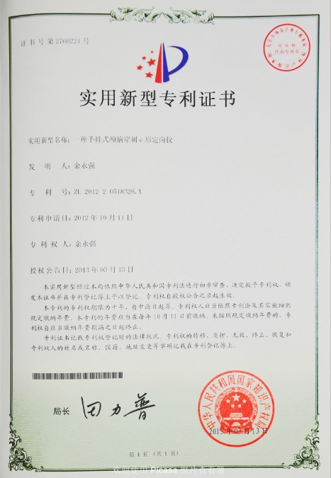 該發(fā)明專利名稱是“一種手持式顱腦穿刺e形定向儀”,由國家知識產(chǎn)權(quán)局于2013年3月13日授予國家“實(shí)用新型發(fā)明專利”,專利號ZL201220518326.X,受國家專利保護(hù)。