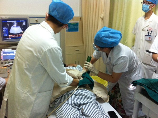 7月18日下午,在我院超聲科7號診室我們成功完成了首例腎穿刺活檢術(shù),標(biāo)志著我院結(jié)束了不能獨(dú)立開展腎穿刺活檢術(shù)的歷史。術(shù)前,我們經(jīng)過了很多次的模擬試穿以及做好了預(yù)防各種并發(fā)癥的充分準(zhǔn)備。術(shù)中在ICU科龍宏杰主任、腎內(nèi)科姚筱主任、超聲科馬曉芹主任、黃劍毅醫(yī)生及腎內(nèi)科護(hù)士們的鼎力協(xié)助下,我科曾曦醫(yī)生通過彩超進(jìn)行了精確定位,姚主任在超聲的引導(dǎo)下,成功地為患者進(jìn)行經(jīng)皮腎臟穿刺活檢術(shù),整個(gè)操作過程準(zhǔn)確流暢。