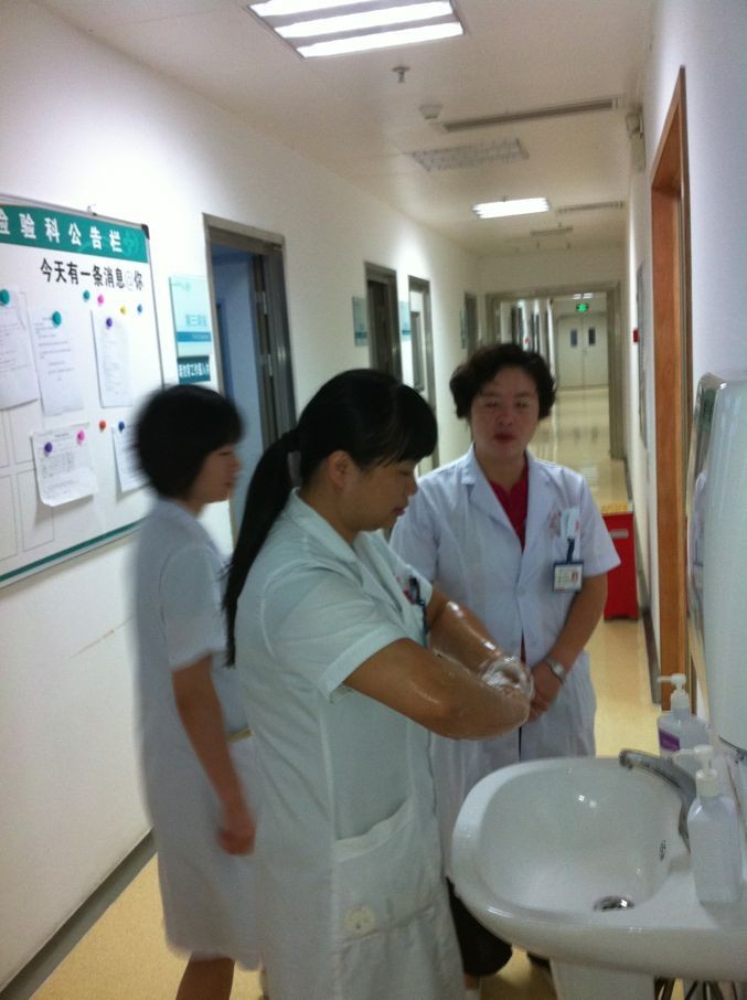 最后,邱淑妍同志為大家詳細地介紹了手衛(wèi)生洗手指針和正確的洗手方法,并在現(xiàn)場帶領(lǐng)大家一起學習,會后還對全科同事進行手衛(wèi)生洗手考核。