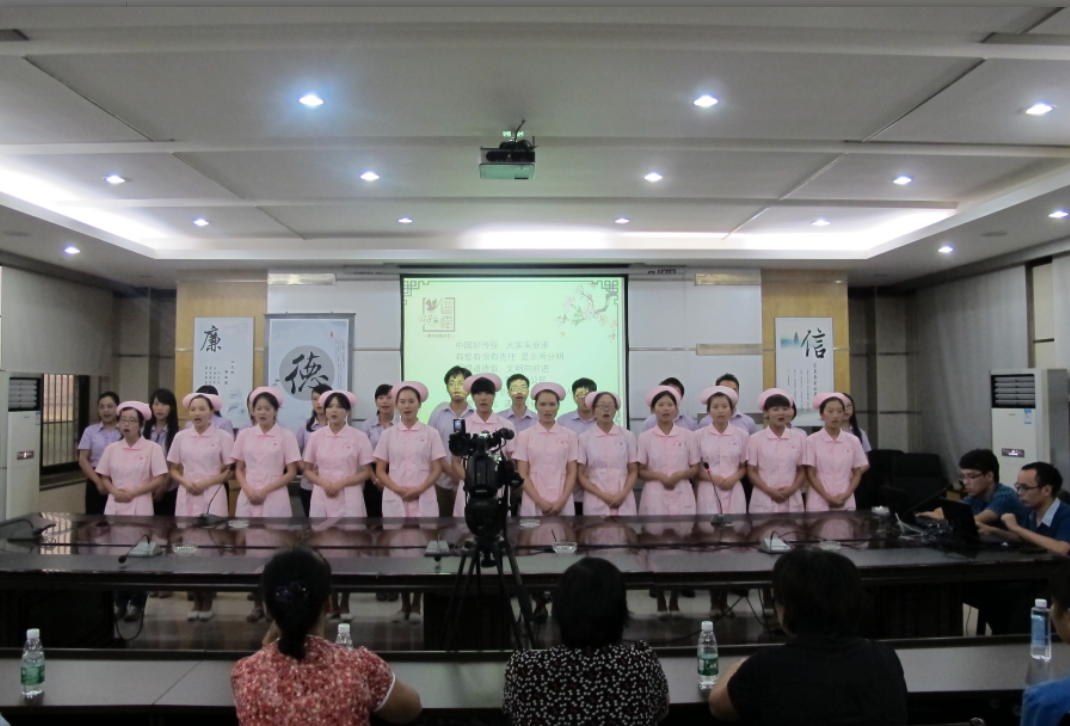 道德講堂共有7個(gè)環(huán)節(jié),分別是:自我反?。?/span>開場三問)、唱歌曲(公民道德歌)、播放一部短片(醫(yī)院介紹、醫(yī)院模范事跡)、學(xué)模范(肖純、陳小凱和陳遂華先進(jìn)事跡)、誦經(jīng)典、發(fā)善心、鞠躬禮。