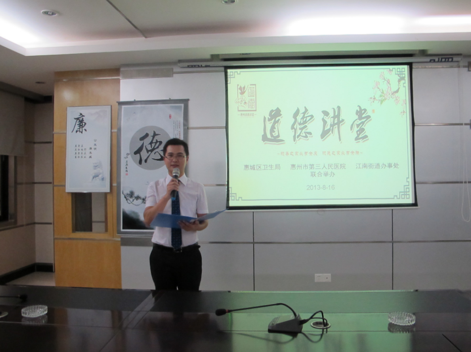 2013年8月16日下午,在江南街道辦文化站4樓,我院與惠城區(qū)衛(wèi)生局、江南社區(qū)舉辦第一期道德講堂。