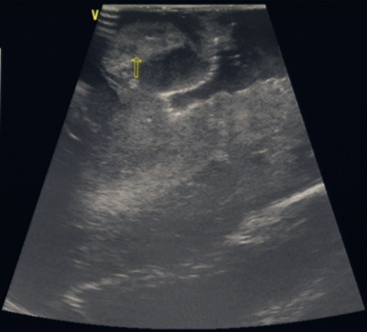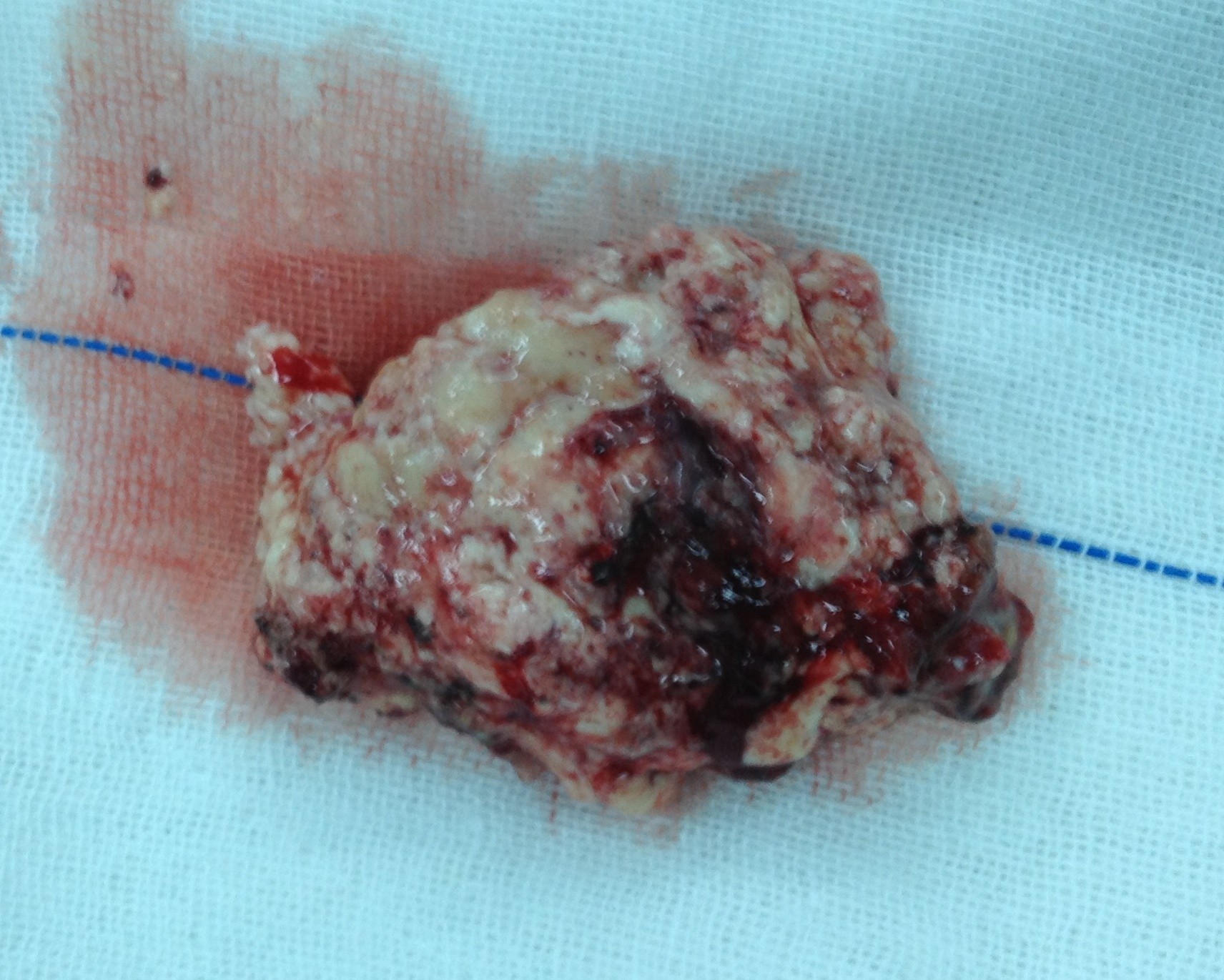 當(dāng)天,在B超室的大力支持和配合下,手術(shù)順利地進(jìn)行。術(shù)中應(yīng)用我院平常的床邊B超機(jī),選擇一個(gè)與術(shù)區(qū)相當(dāng)?shù)?span>B超探頭,裹上無(wú)菌膜即可使用。在切除腫瘤過程中,用B超探頭貼近術(shù)區(qū)探測(cè)腫瘤的范圍及位置,在B超引導(dǎo)下一步步切除腫瘤。當(dāng)手術(shù)行將結(jié)束時(shí),再次應(yīng)用B超探測(cè),清楚地發(fā)現(xiàn)腫瘤殘留,并進(jìn)一步切除干凈。結(jié)果,本例手術(shù)切除了95%以上的腫瘤組織,取得了圓滿的成功。