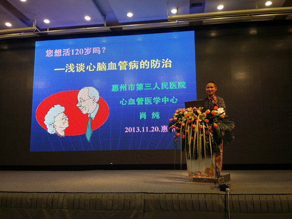 11月20日晚,旭日集團(tuán)的多功能會(huì)議廳燈火通明,近五百名員工濟(jì)濟(jì)一堂,利用下班時(shí)間來(lái)參加由三院心血管醫(yī)學(xué)中心肖純博士主講的《您想活120歲嗎?——淺談心血管病的防治》。相信大家在預(yù)報(bào)名環(huán)節(jié)都不同程度得被講座的主題所吸引,肖純博士正是圍繞著這一主題,對(duì)心血管病的防治娓娓道來(lái)。