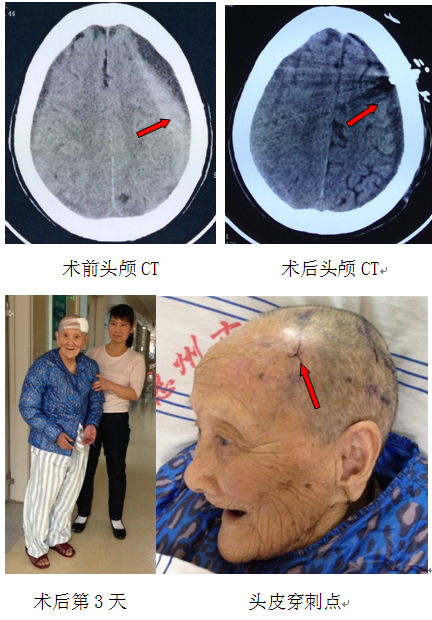 老奶奶因頭痛多天,家鄉(xiāng)經(jīng)初步治療無效后,在兒孫的陪同下就診我院內(nèi)科。行頭顱CT檢查提示左側(cè)額顳頂枕巨大的硬膜下血腫,已嚴重壓痛腦組織致神志、精神差和右側(cè)肢體偏癱。收住我院的神經(jīng)外科,經(jīng)家屬同意,予第二天在局麻下行改良的“微創(chuàng)穿刺沖洗引流術(shù)”,手術(shù)中沖洗引流處血腫約100ml。術(shù)后第1天患者神志清楚,精神良好,右側(cè)肢體偏癱好轉(zhuǎn),復(fù)查頭顱CT示血腫已清除。術(shù)后第2天拔除留置的引流管,術(shù)后第8天辦理出院。