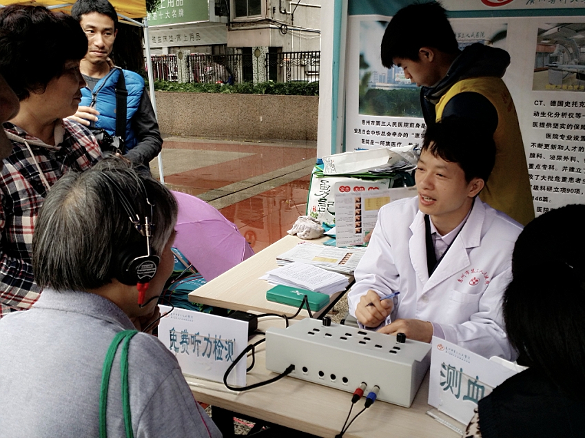 到場(chǎng)開展義診活動(dòng)的單位有惠州市疾病預(yù)防控制中心、惠州市中醫(yī)院、第一人民醫(yī)院等,包括我院在內(nèi)共有7家醫(yī)院。我院組織各科專家主任共8位,有心血管內(nèi)科劉凌博士、心胸外科鐘衛(wèi)權(quán)主任、內(nèi)分泌科李桂平主任、康復(fù)科武行華主任、乳腺科鄒燕鵬副主任醫(yī)師、感染科利旭輝主任、神經(jīng)內(nèi)科黃志勇主任、耳鼻喉科王豪主任,及志愿者工作人員7位。義診項(xiàng)目包含現(xiàn)場(chǎng)??谱稍儭⒚赓M(fèi)測(cè)血壓、測(cè)血糖、聽力檢測(cè)、發(fā)放宣傳資料等。