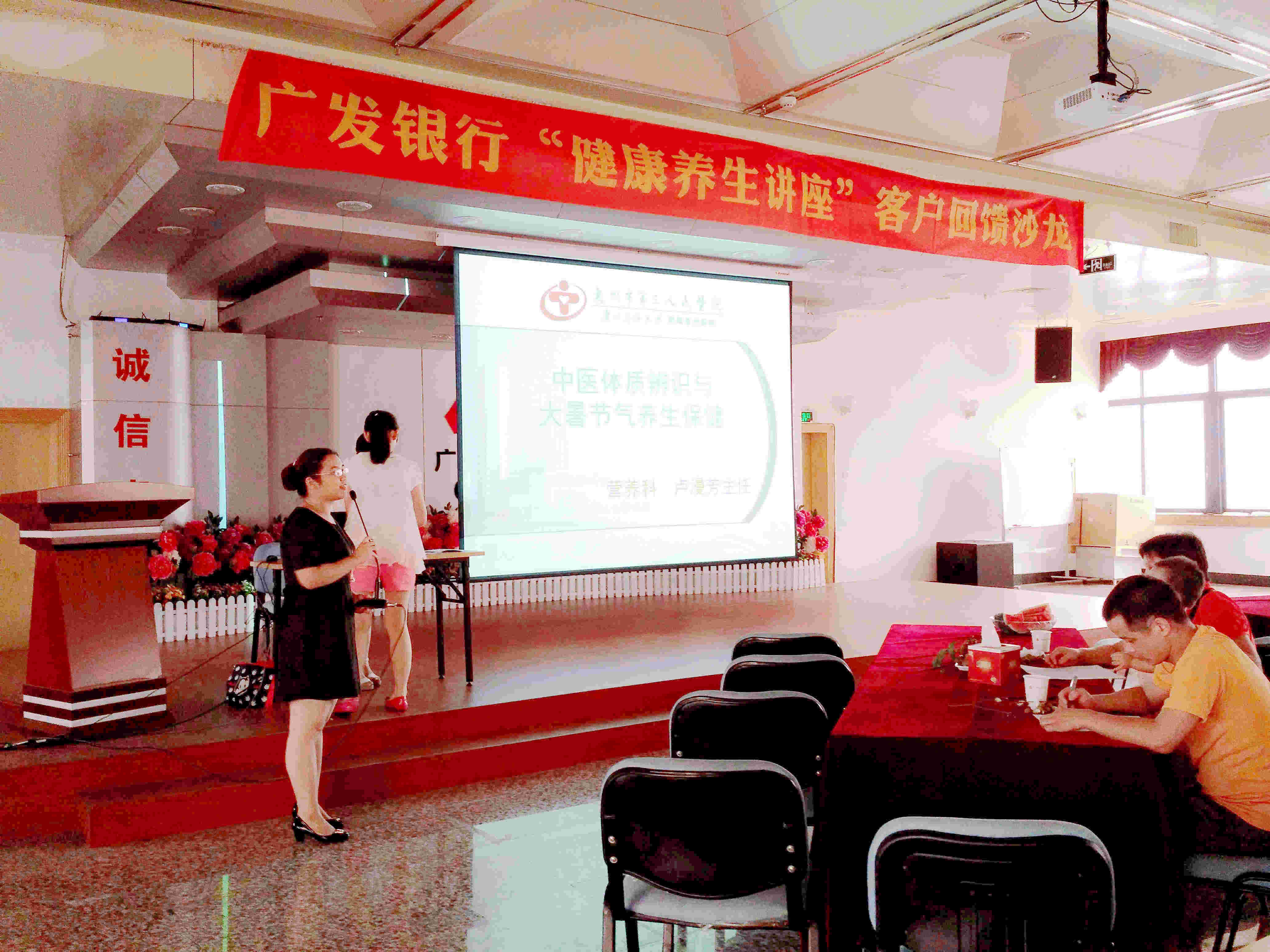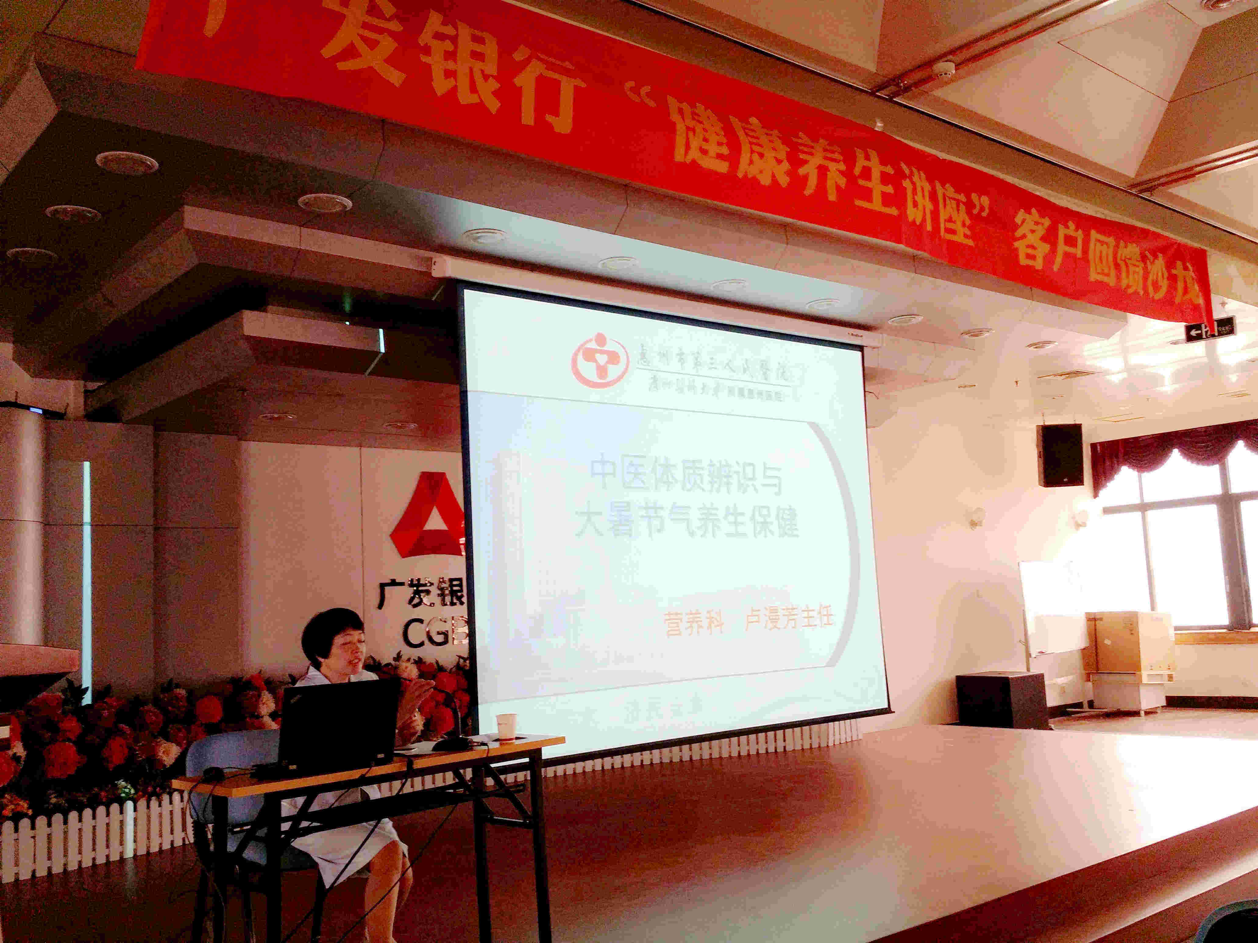 今年的大暑節(jié)氣是7月23日到8月6日,雖然是熱至極,但已經(jīng)是酷暑的尾巴了,大暑時節(jié)濕熱蒸郁,往往人無精神,食欲欠佳。為了給大家在盛夏帶來一絲清涼,正確避暑、科學(xué)養(yǎng)生,廣發(fā)銀行特邀我院營養(yǎng)科盧漫芳主任給銀行的高端理財客戶送上了一堂“中醫(yī)體質(zhì)辨識和大暑節(jié)氣的養(yǎng)生保健”課程。