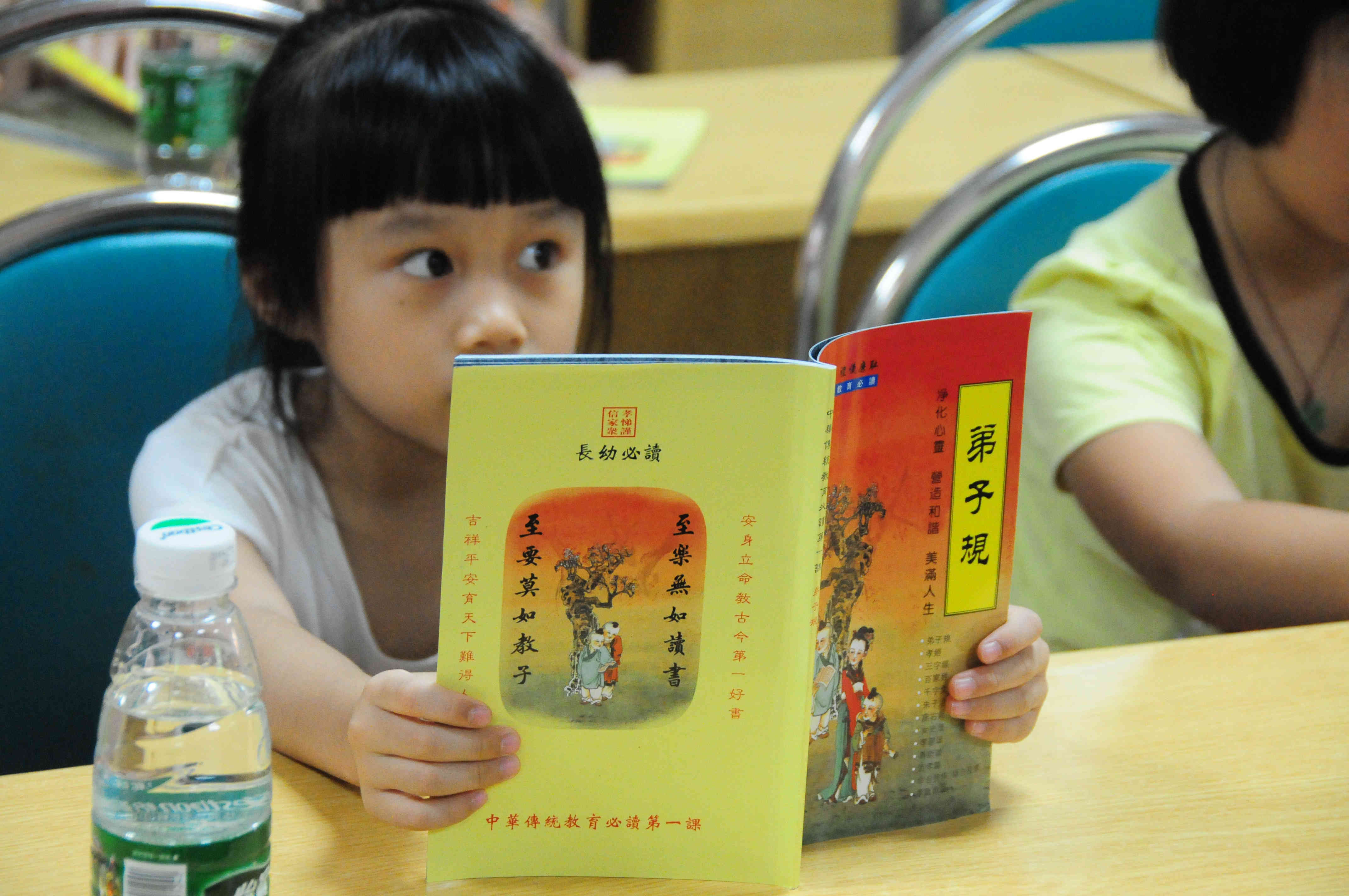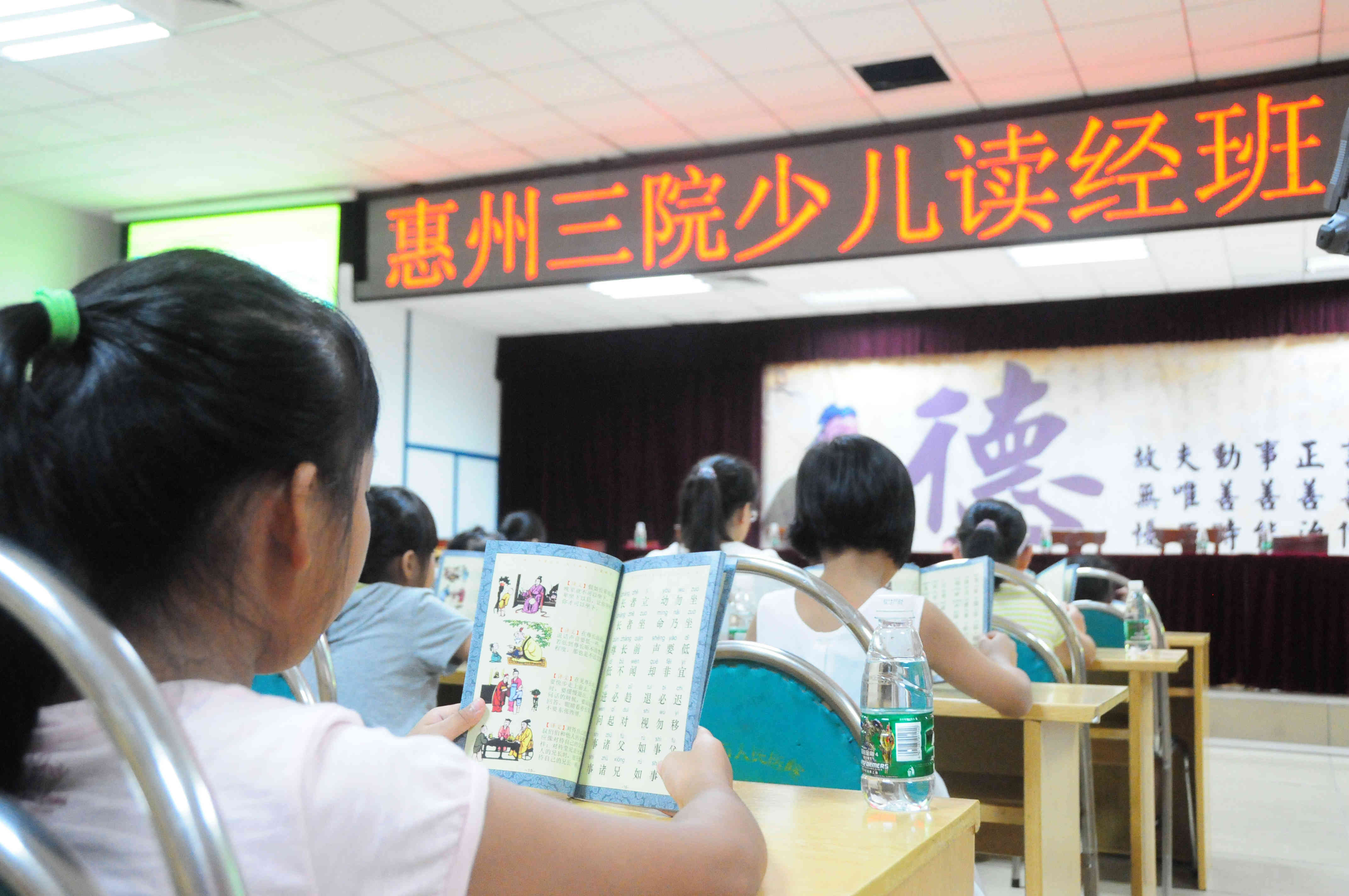 今年暑期,微笑愛(ài)心扶老助學(xué)會(huì)借用惠州高迪技工學(xué)校開(kāi)班了一個(gè)為期21天的封閉式少兒讀經(jīng)班。惠州市微笑愛(ài)心扶老助學(xué)會(huì)會(huì)長(zhǎng)董筱蘭介紹,暑期班開(kāi)設(shè)6個(gè)班,學(xué)習(xí)背誦《弟子規(guī)》、《道德經(jīng)》、《孝經(jīng)》和《易經(jīng)》等經(jīng)典古文。這是惠州市微笑愛(ài)心扶老助學(xué)會(huì)組織的第4次假期少兒讀經(jīng)班。第一次在2012年的國(guó)慶節(jié),29名少兒參加,2013年的暑假和國(guó)慶節(jié)舉行了兩次,參加的少兒越來(lái)越多,分別為60多人和80多人,而今年的人數(shù)則突破百人。董老師還開(kāi)辦了免費(fèi)幼兒園,她說(shuō),教育需從小抓起,讓孩子從小耳濡目染,才能融會(huì)貫通。