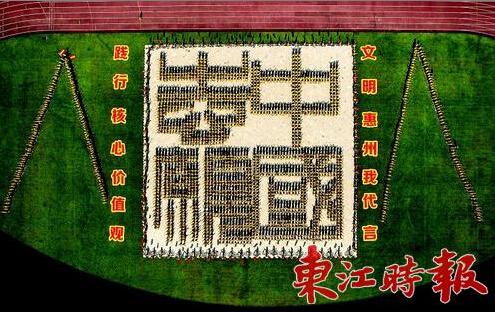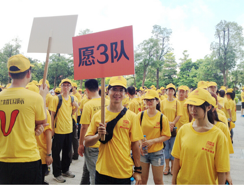 當(dāng)日,3422名志愿者參與了活動(dòng)啟動(dòng)儀式,志愿者身穿印有“惠州志愿者”字樣的黃色T恤衫,用大型方陣隊(duì)形演繹出一枚印章“中國(guó)志愿”四個(gè)字,印章外圈為騎行隊(duì)和旗幟,印章兩旁是“踐行核心價(jià)值觀,文明惠州我代言”14個(gè)大字,場(chǎng)面極其壯觀。