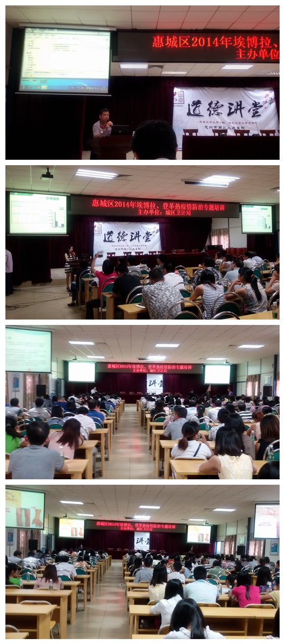 為進(jìn)一步做好埃博拉、登革熱疫情防控和醫(yī)療救治工作,做到“早發(fā)現(xiàn)、早報(bào)告、早隔離、早治療”,根據(jù)上級(jí)文件精神,2014年10月10日和17日,在惠城區(qū)衛(wèi)計(jì)局組織下,惠州市第三人民醫(yī)院針對全區(qū)醫(yī)務(wù)人員舉辦了兩期關(guān)于埃博拉、登革熱疫情防治相關(guān)知識(shí)的專題培訓(xùn)。