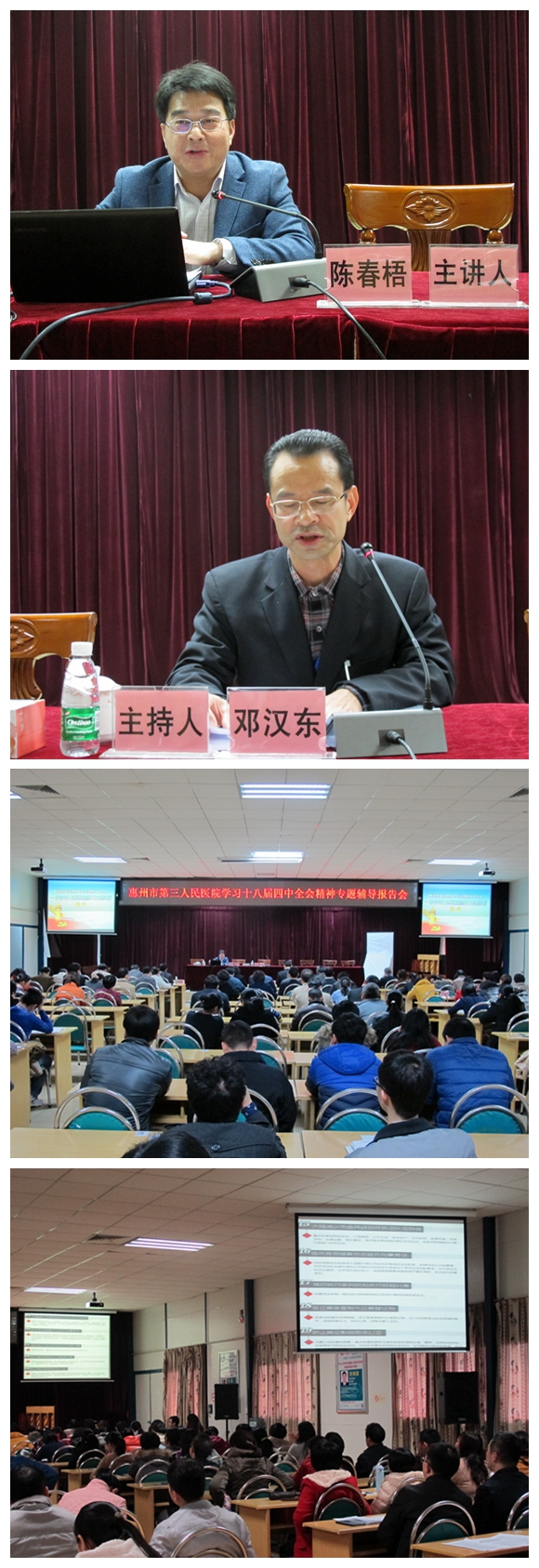 醫(yī)院黨委鄧漢東書記表示,陳校長給大家上了一堂精彩的專題輔導(dǎo)課,深刻、生動、簡要地詮釋了十八屆四中全會精神內(nèi)涵。他強調(diào)黨員干部要帶頭認真學(xué)習(xí)領(lǐng)會四中全會精神,把全會精神實質(zhì)貫徹落實到日常工作中,促進醫(yī)院更好更快發(fā)展。(黨委辦 潘穎科)