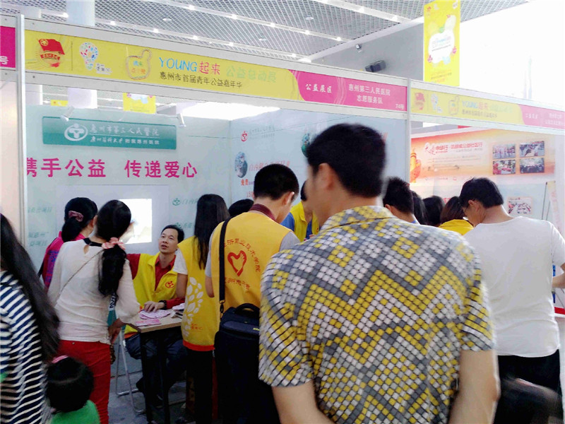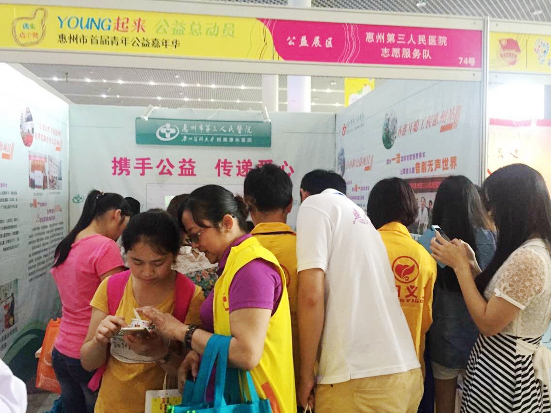 4月25日、26日兩天,由團(tuán)市委聯(lián)合市文明局、市社工委、市民政局等單位共同舉辦的惠州市首屆青年“公益嘉年華”活動(dòng)在惠州會(huì)展中心舉行。我院也積極參與了本次活動(dòng),并在公益展區(qū)向惠州市民展示了惠州市第三人民醫(yī)院的“關(guān)愛女性 幸?;葜荨比橄倨詹?、“慈愛救心”兒童先心病救治項(xiàng)目、“耳聰工程”、“白內(nèi)障免費(fèi)篩查”等四大公益項(xiàng)目相關(guān)內(nèi)容,呼吁更多人關(guān)注和支持慈善公益事業(yè)。